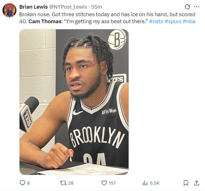 赛后托马斯谈到自己的伤势,鼻子被打了一下,眉骨缝三针,手部还在冰敷,这场比赛我被马刺球员们打惨了。