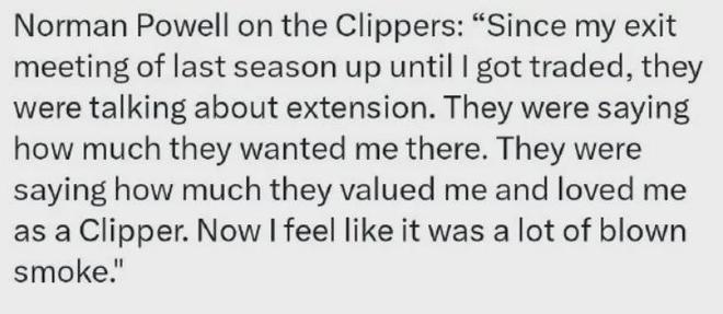 话说鲍威尔对被突然交易一事相当愤愤不平,前几天接受采访公开怒喷快船说重视他等话语全部是空话,同时“抱怨”称在哈登&伦纳德等球星身边打球容易被忽略,无论表现多么出色。