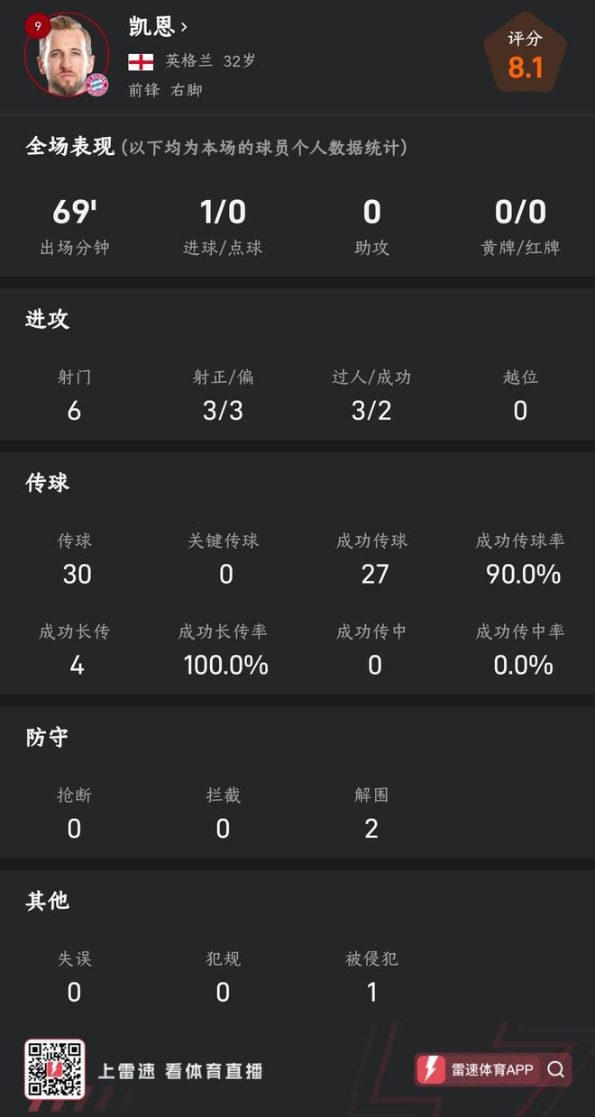 传球方面,凯恩全场30次传球,其中27次传球成功,传球成功率达到90%。值得一提的是,凯恩此役4次尝试长传且全部成功。